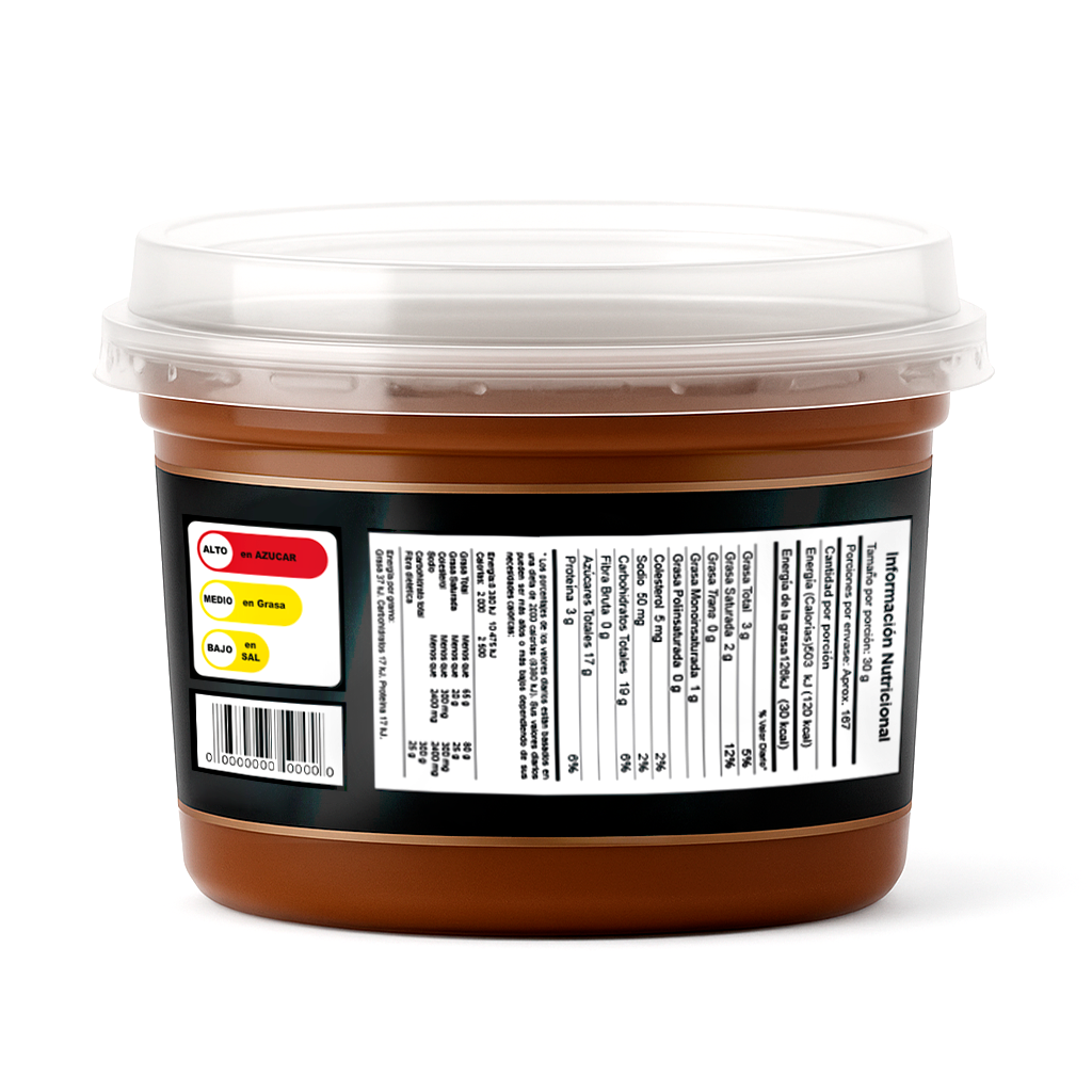 Especificaciones: tarrinas selladas, etiqueta nutricional y semáforo de advertencia.